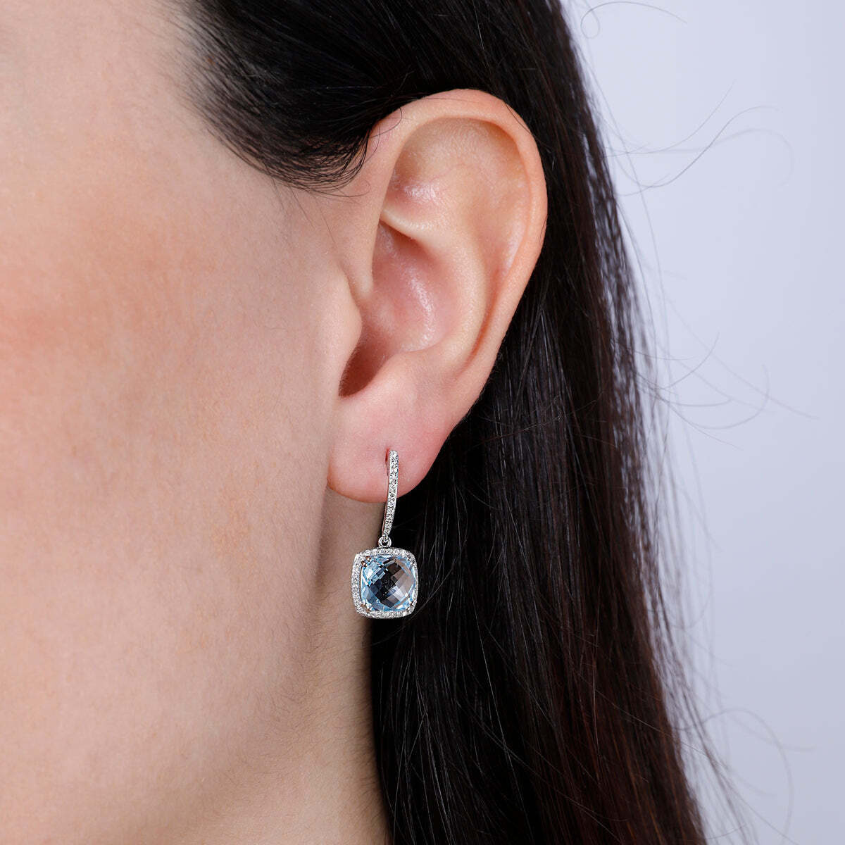 Elevate your style with this stunning earrings. The cushion-cut gems are accented by diamond halos, creating a mesmerizing contrast. Crafted in polished gold, these earrings are perfect for any occasion. A great gift for someone special or a stylish addition to your own collection. Additional metal & gemstone options are available. Please inquire below for further information.