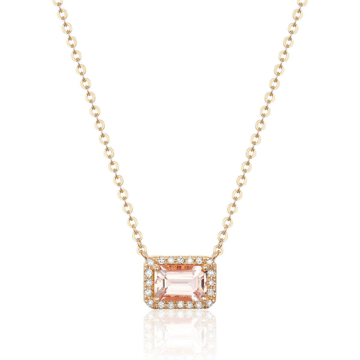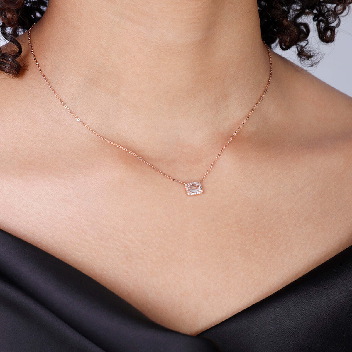 Drawing out the shimmer and sophistication of this Emerald Cut Halo Necklace, fourteen Karat gold has been used for high-end craftsmanship. When placed around the neck, this elegant piece will bring effortless luxury. The stones of the necklace are set superbly to ensure the creation of a luxurious look. Additional metal & gemstone options are available, pricing may vary. Please inquire below for further information.