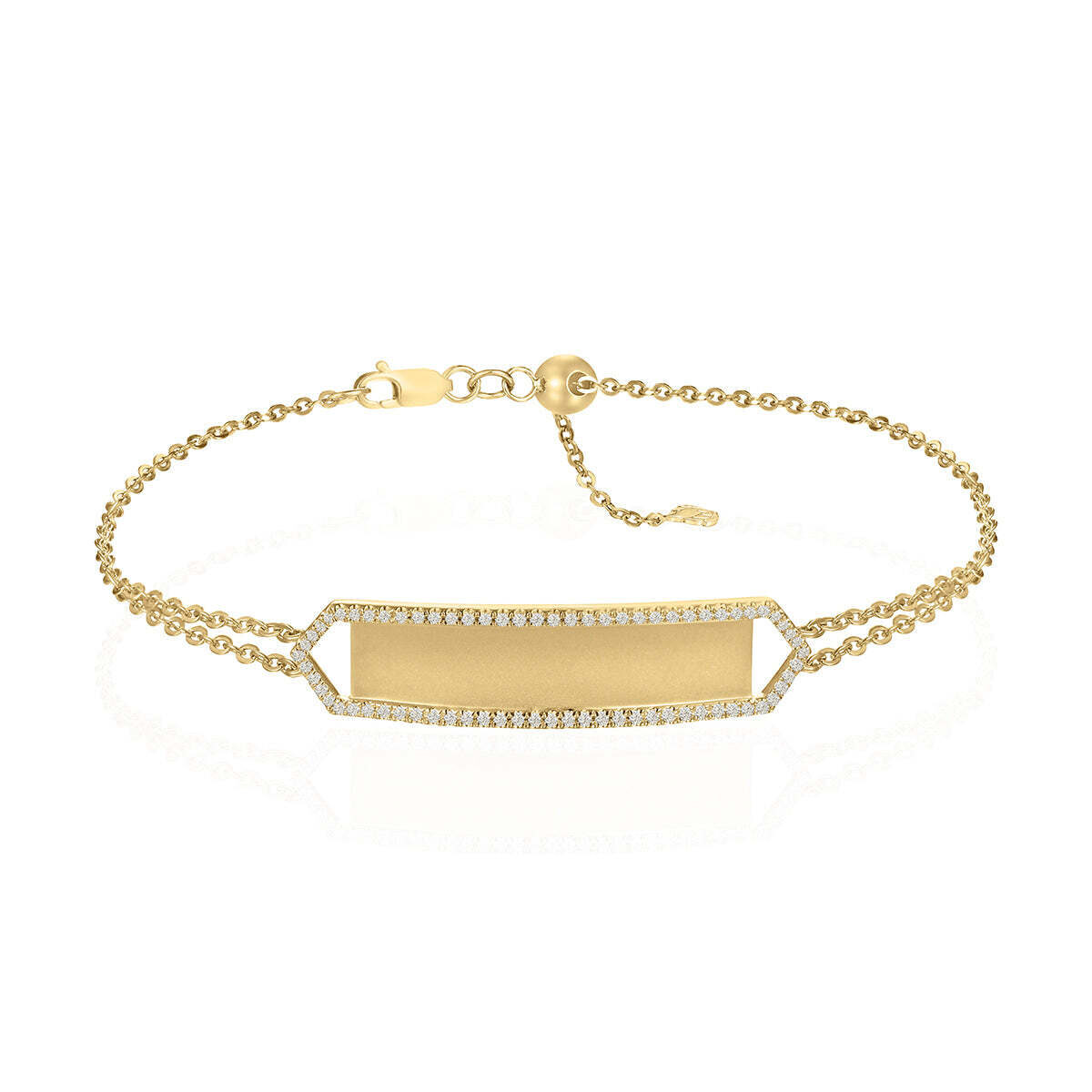Your personalized bracelet is made of 14K gold and features brushed gold and diamond accents. The length of the bracelet can be adjusted to fit your wrist perfectly, making it the perfect size for any occasion.