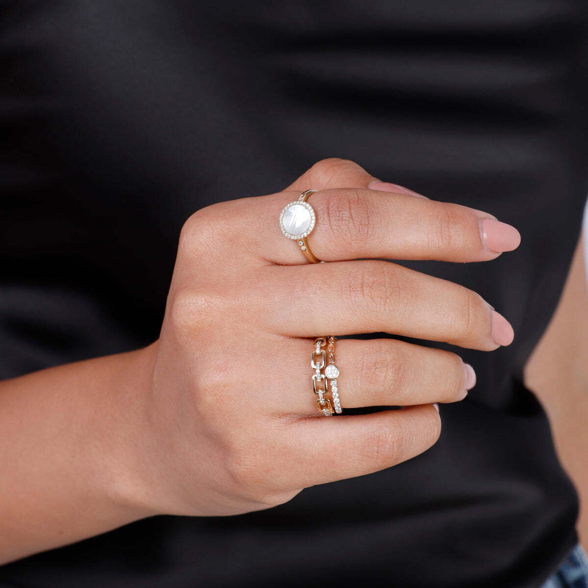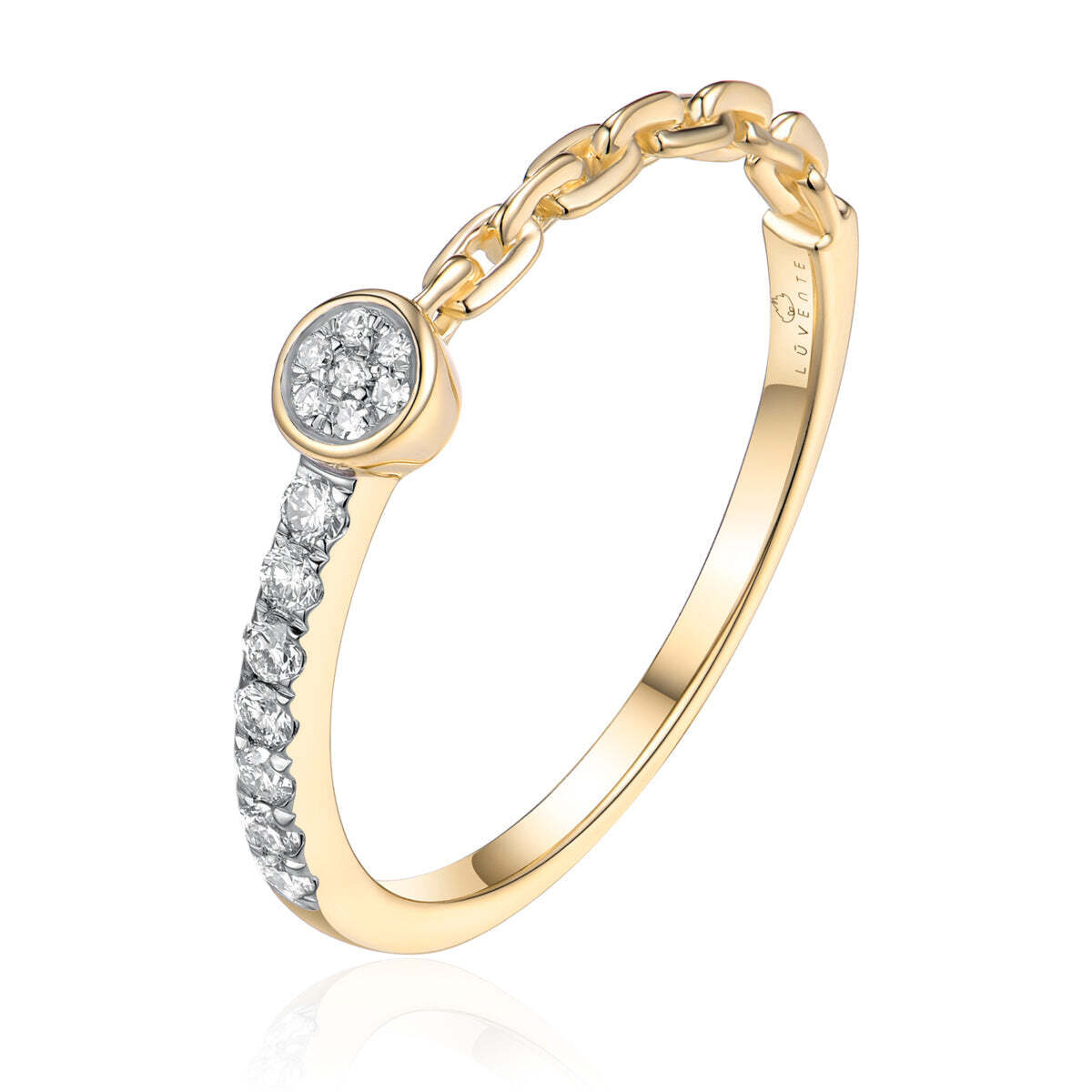 Edgy. Bold. Glamourous. Meet our Split Chain & Bar Round ring. The design features a 14k gold chain and diamond bar wrapped around your finger with a dazzling cluster of round diamonds in the center. Whether you're stepping out for a night on the town or a romantic date, this ring adds a touch of elegance and glamour to any look.